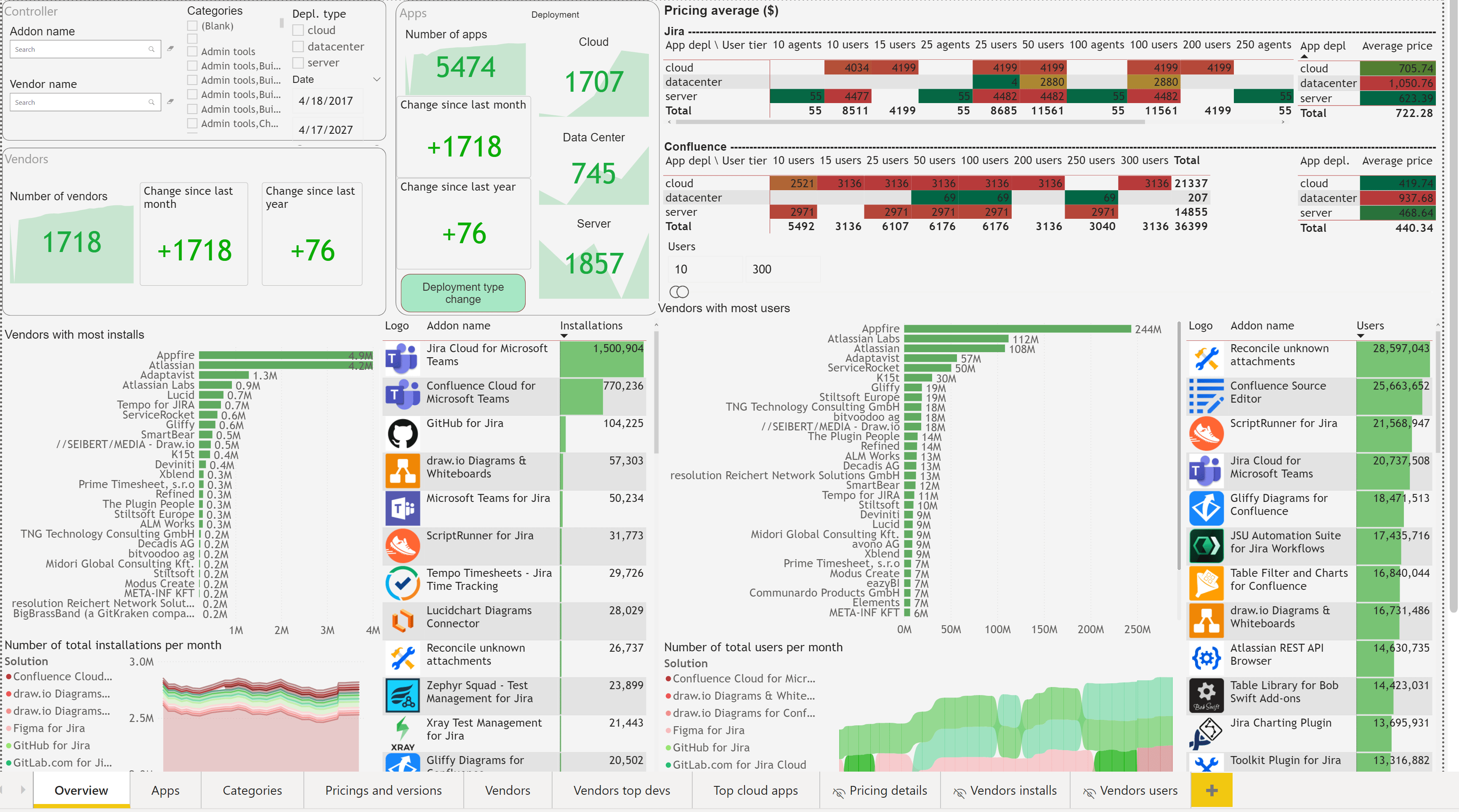 We collect information on apps in the Atlassian marketplace, including app popularity, price development over time and growth in different app categories. These data points are enriched by our consultants with aety proprietary knowledge, and the result is a platform with extensive information on the Atlassian marketplace over time.